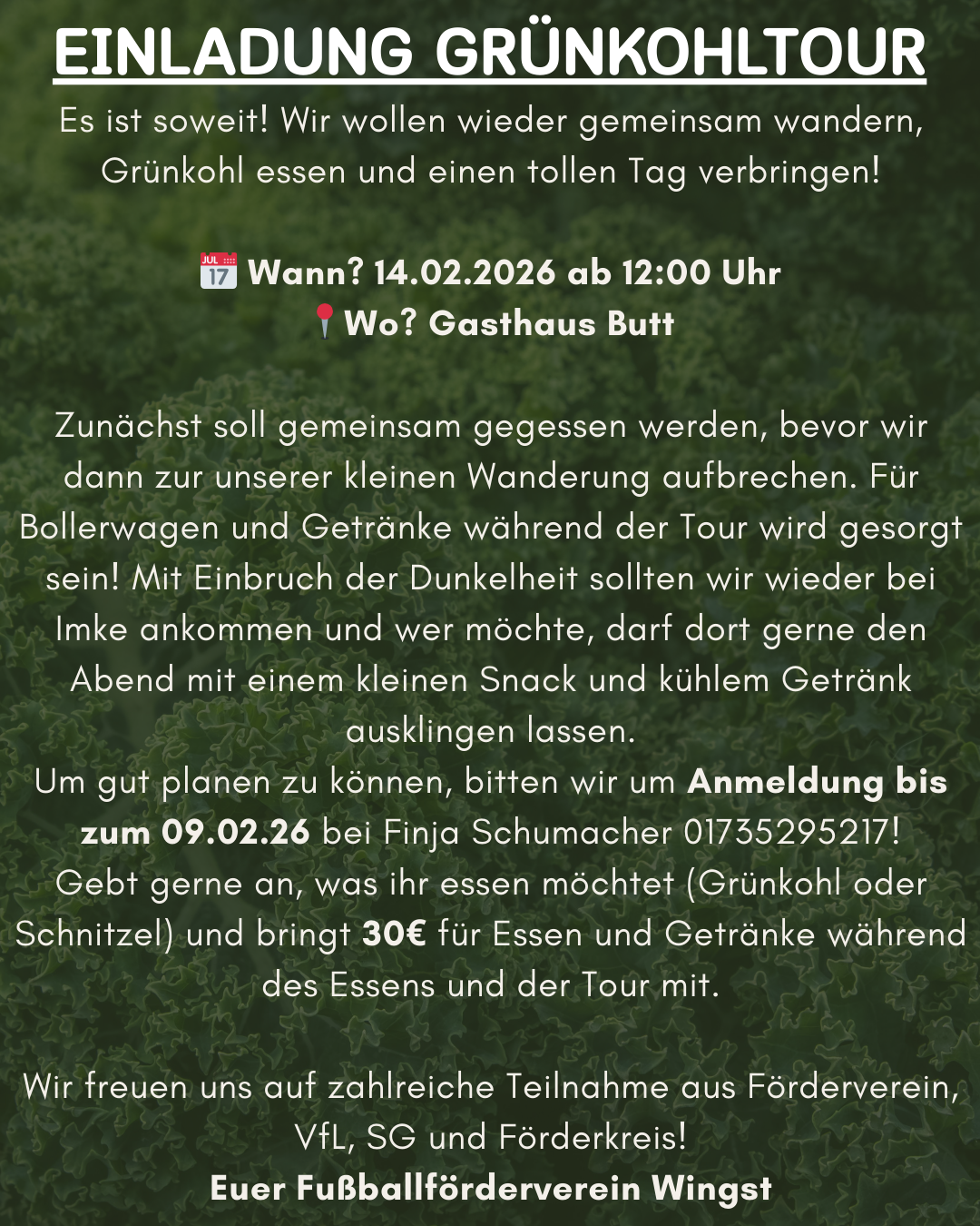 Auch dieses Jahr findet wieder eine Grünkohltour statt, zu der alle herzlich willkommen sind!