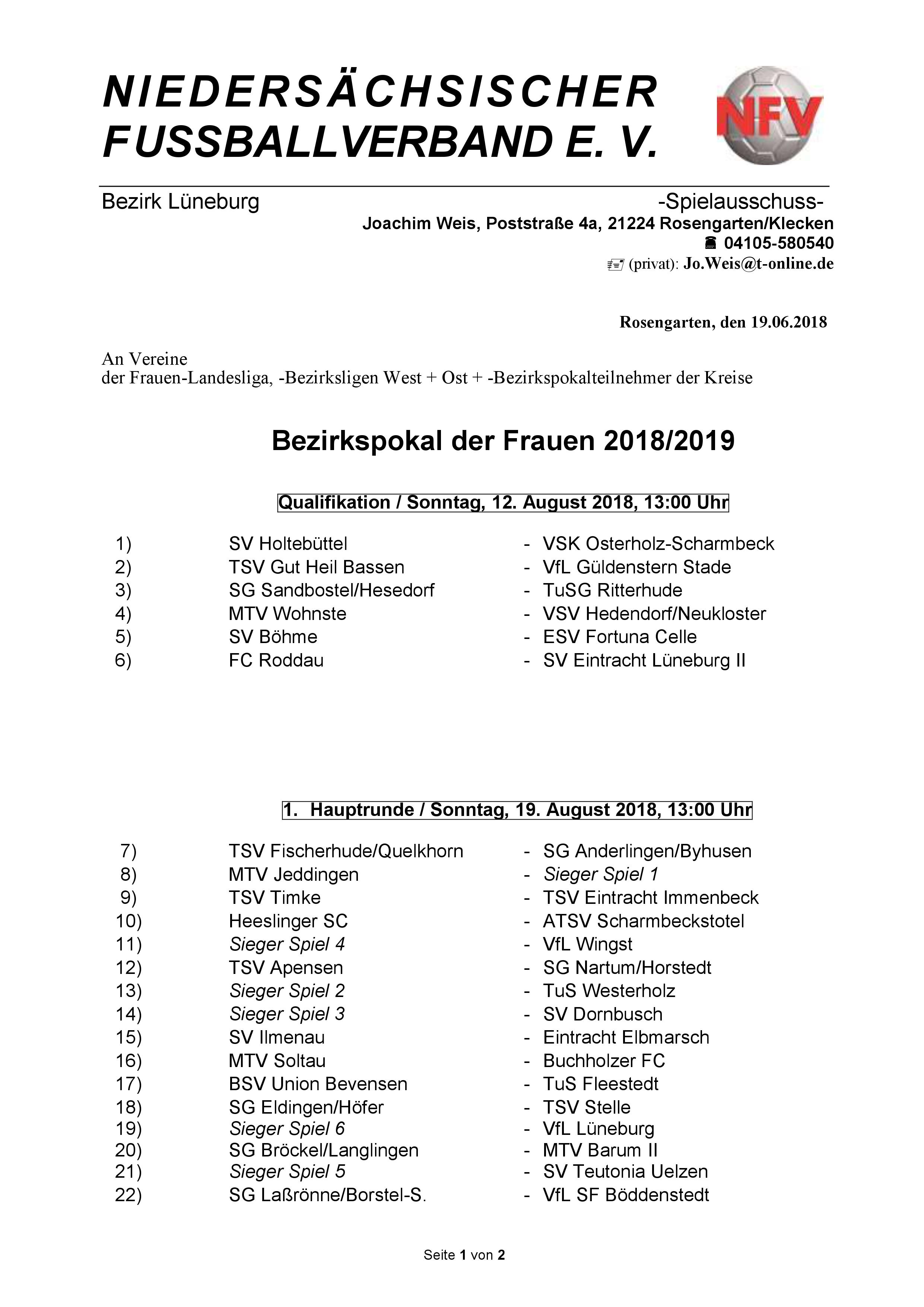 die Auslosung im Bezirkspokal der Frauen ist erfolgt. Unsere 1. Mannschaft muss am 19. August gegen den Sieger MTV Wohnste - VSV Hedendorf/Neukloster antreten...