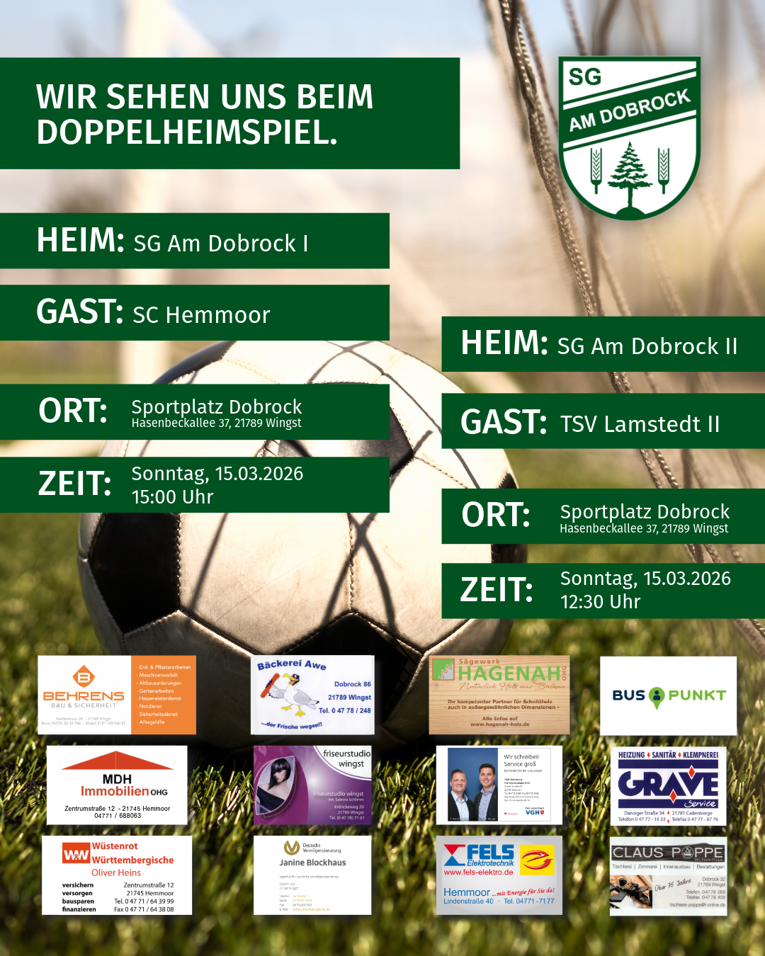 Am Sonntag steht wieder ein spannender Fußballtag auf dem Sportplatz Dobrock an und gleich beide Teams der SG Am Dobrock sind zuhause im Einsatz!