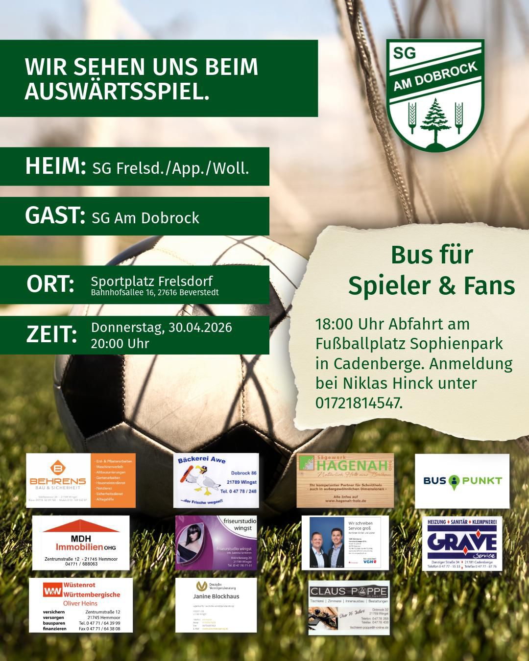 Am Donnerstag, den 30. April, geht’s für unsere SG Am Dobrock zum Auswärtsspiel gegen die SG Frelsdorf/Appeln/Wollingst. Anpfiff ist um 20:00 Uhr in Frelsdorf.