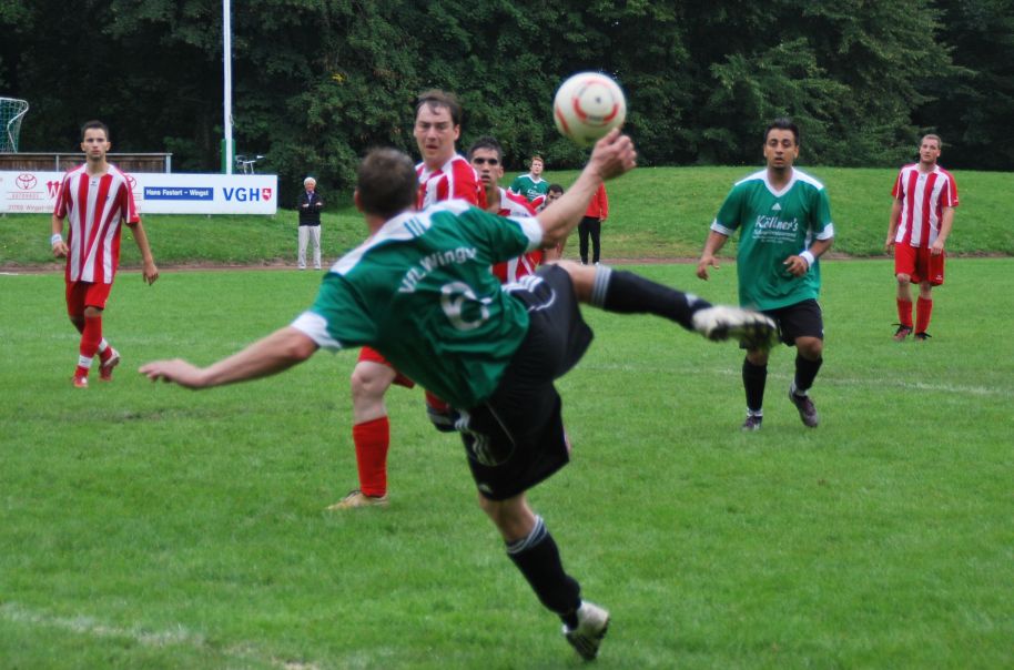 Die Zuschauer sahen einen wahren Krimi, denn nach einem 0:1-Pausenrückstand lagen die Wingster in der 70. Minute bereits mit 0:3 im Hintertreffen. Doch dann ging ein Ruck durch die Mannschaft und Ralf Dobrocky verkürzte auf 1:3. Nur drei Minuten später traf Almir Uksinsi zum 2:3-Anschlußtreffer. Nach hervorragender Vorarbeit von Routinier Jens Reyelt traf Olaf Stegemann zum 3:3-Ausgleich. Doch damit gaben die Winggster sich nicht zufrieden. Dem überragenden Jens Reyelt gelang in der Nachspielzeit der verdiente 4:3-Siegtreffer. Für Wingst spielten Sebastian Kuck (Tor), Nils Köllner, Valon Hajrizi (Sven Ramm), Ralf Dobrocky, Kevin Brandt, Zafer Elma (Olaf Stegemann), Mike Schäfer, Jan Grabbe, Jens Reyelt, Tobias Meyer, Mustapha Yilmaz (Almir Uksini).