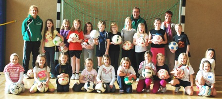 Eine der Aufgaben bei diesem Wettbewerb, ist dabei die Durchführung einer Mädchenfußball-AG. Dieses „Projekt“ ist nun gemeinsam in Angriff genommen worden. Seit dem 9. Februar bis zu den Sommerferien, wird die Arbeitsgemeinschaft jeweils mittwochs in der 6. Stunde stattfinden. Dabei wird nicht nur Fußball gespielt, sondern es werden auch Grundkenntnisse zur Geschichte des Fußballs, zu den Spielregeln usw. vermittelt. Die Durchführung liegt bei den erfahrenen und qualifizierten Übungsleitern Imke Dick, Karsten Frahm (Praxis) und Michael Schlobohm (Theorie). Das Foto zeigt die Mädchen der neuen AG, Imke Dick, Karsten Frahm und Schulleiterin Sabine Cordes beim „Startschuß“