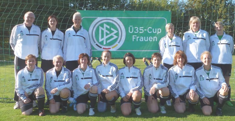 Der VfL Wingst hat den NFV Kreis Cuxhaven beim DFB-Ü 35-Frauen-Cup in Leipzig stark vertreten und belegte als Vertreter des Norddeutschen Fußballverbandes einen guten vierten Platz. Das Foto zeigt Trainer Johann Schult, Swantje Reuter, Gerlinde Hasselbusch, Sandra Schütte, Sabine Hartmann, Claudia Sahlke (hinten von links); Britta Klemp, Ilka Buck, Marita Schultz, Frauke Wichmann, Sandra Löffler, Sonja Schütte, Sabine Schäfer, Imke Dick.