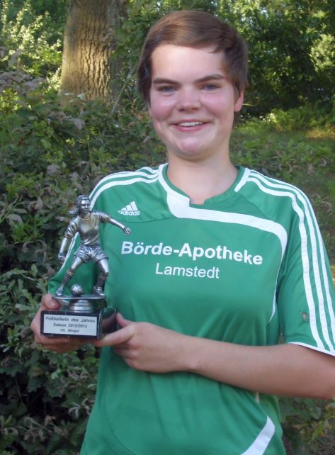 Katharina Dieckmann hat sowohl bei den B-Juniorinnen, als auch bei den Frauen konstant gute Leistungen abgeliefert und fehlte bei fast keinem Spiel, genauso wie beim Training - auch da war sie fast immer dabei. Außerdem engagiert Katharina Dieckmann sich auch außerhalb des Spielfeldes stark für die Mannschaft und tritt dabei immer als Vorbild auf. Die 17-jährige Nachwuchsspielerin ist aus der ersten Frauenmannschaft des VfL Wingst nicht mehr wegzudenken und zeigt bei den Spielen immer vorbildlichen kämpferischen Einsatz von der ersten bis zur letzten Minute.
