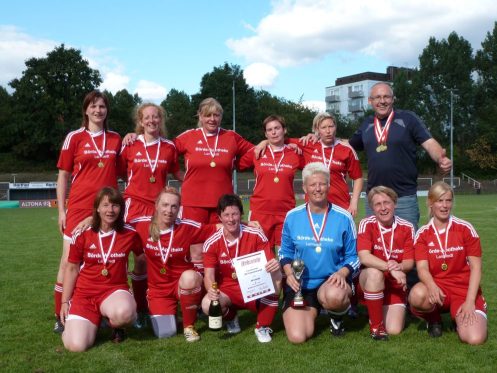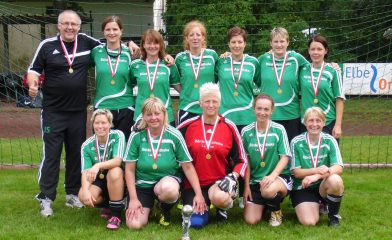 Die verstärkte Wingster Frauenmannschaft konnte am Samstag auf dem Dobrock-Sportplatz ihren Vorjahreserfolg wiederholen und sicherte sich erneut den Titel des Norddeutschen Meisters. Nach Erfolgen gegen den Niendorfer TSV (2:1, Swantje Reuter (2)), BSV Hamburg (2:1, Swantje Reuter und Sandra Schütte) und UT Kiel (4:0, Frauke Wichmann, Swantje Reuter (3)) in den Gruppenspielen gelangte das Team von Trainer Johann Schult ins Halbfinale. Dort traf man auf den TSV „Eiche“ Neu St.Jürgen und siegte deutlich mit 3:0 (Sandra Schütte (2) und Swantje Reuter). Im Finale war dann erneut der Niendorfer TSV der Gegner der Wingsterinnen. Durch die zweifache Torschützin Sandra Schütte gelang ein ungefährdeter 2:0-Sieg und damit der erneute der Titelgewinn. Damit haben sich die Wingster Frauen für die Deutsche Meisterschaft vom 6. bis 8. September in Leipzig qualifiziert. Das Meisterfoto zeigt Trainer Johann Schult, Swantje Reuter, Sabine Schäfer, Imke Dick, Sonja Schütte, Claudia Sahlke, Sandra Löffler (hinten von links); Sandra Schütte, Sabine Hartmann, Gerlinde Hasselbusch, Frauke Wichmann, Marita Schulz.