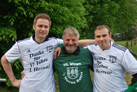 Beim Saisonabschluß der Wingster Fußballer wurden kürzlich Dennis Föge, Meinhard Baack und Sascha Regner aus dem Kreis der 1. Herrenmannschaft verabschiedet. Trainer Thomas Flemming und Co-Trainer Timo Horeis bedankten sich bei Sascha Regner für 21 Jahre und bei Dennis Föge für 17 Jahre Zugehörigkeit zur „Ersten“. Aufgrund der großen Personalknappheit kam Meinhard Baack (49) zum Schluß der Saison noch zu einigen überraschenden Einsätzen und markierte dabei sogar noch einen wichtigen Treffer.