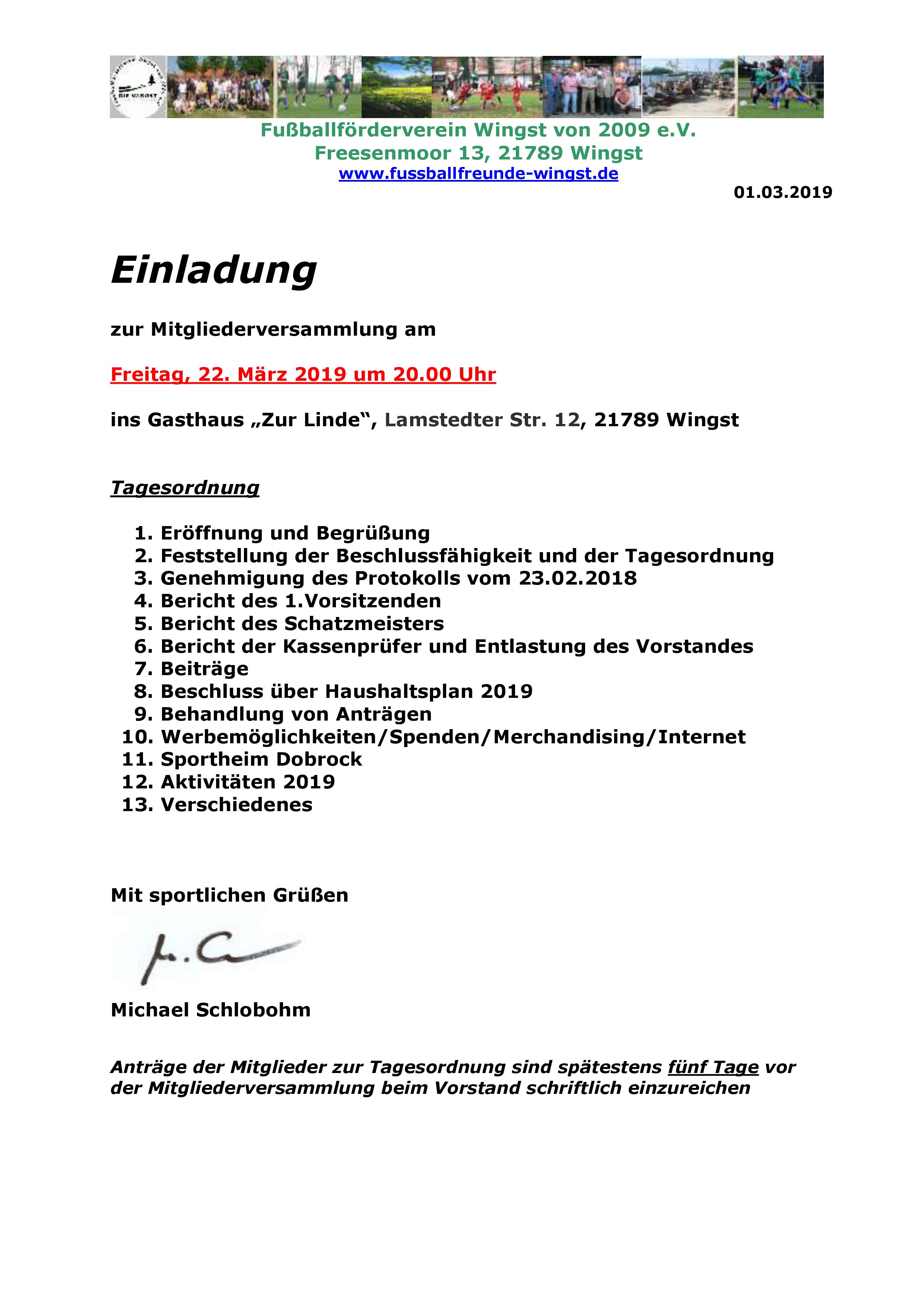 am Freitag, 22. März 2019 findet die diesjährige Mitgliederversammlung bei Kröncke in Weißenmoor statt. Hier die Einladung: