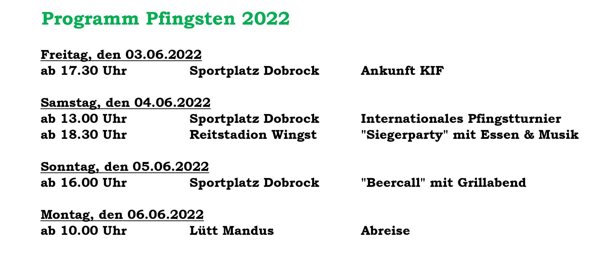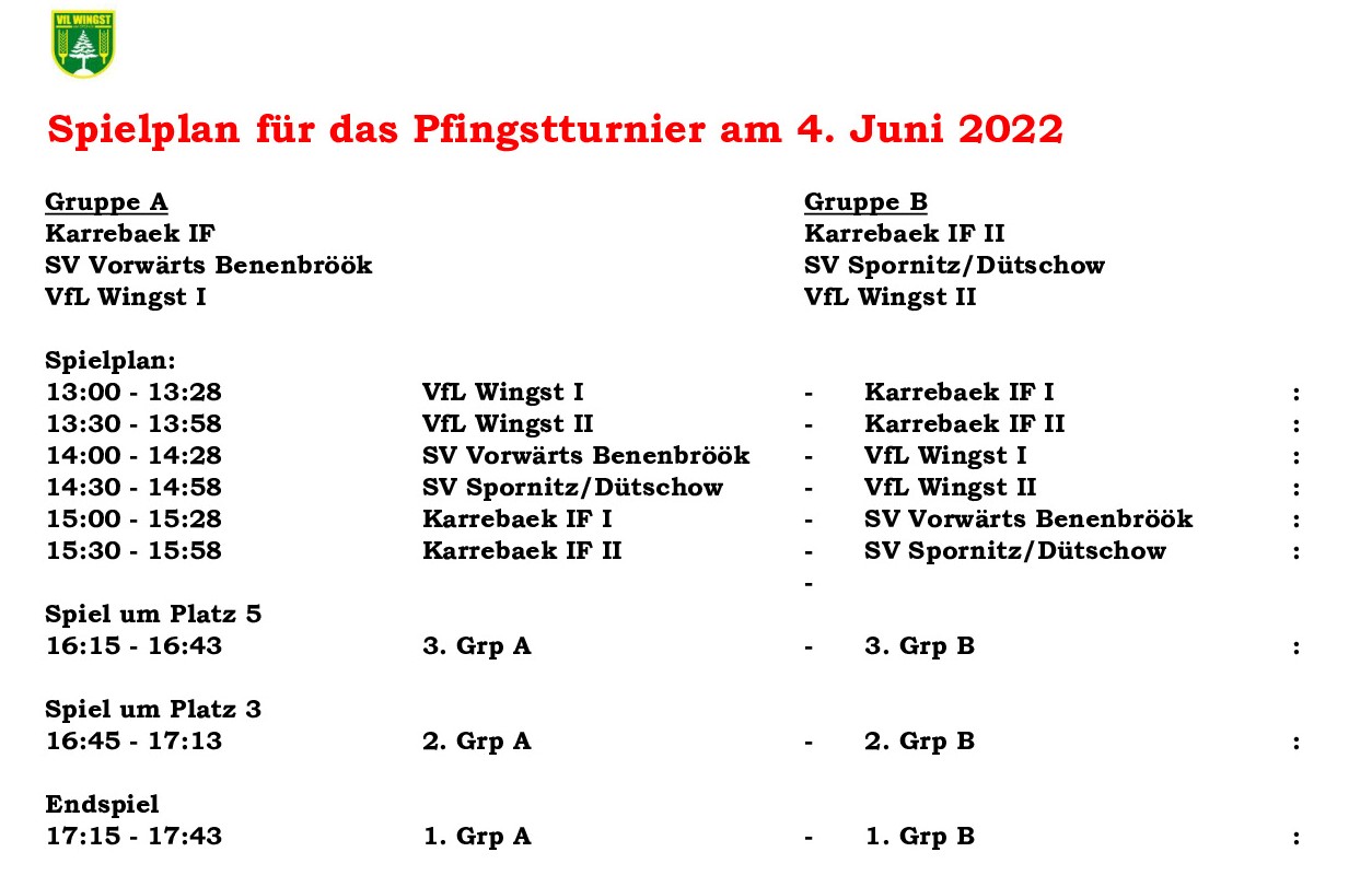 Am Pfingstsamstag findet das Internationale Pfingstturnier ab 13 Uhr auf dem Dobrock-Sportplatz statt. Sechs Mannschaften kämpfen in zwei Gruppen um den Turniersieg. In der Gruppe A spielen Karrebaek IF I, SV Vorwärts Benenbröök und der VfL Wingst I. In der Gruppe B treffen SV Spornitz/Dütschow, Karrebaek IF II und der VfL Wingst II aufeinander. Das Endspiel ist für 17.15 Uhr terminiert. Anschließend findet dann die Siegerehrung mit gemeinsamem Essen aller Mannschaften und Fans statt.