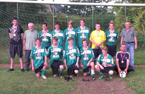 Auf dem Foto (hinten von links) Josuha Woltmann, Detlef Hein, Tim Wiebalck, Jan Baack, Hergen Katt, Max Meyer, Fritz Drewes, Daniel Miertsch, KJO Horst Grotheer. Unten von links: Conrad Huffmann, Philip Prinz, Marvis Wobser, Niklas Riedel, Hendrik Peter und Trainer Peter Wiebalck