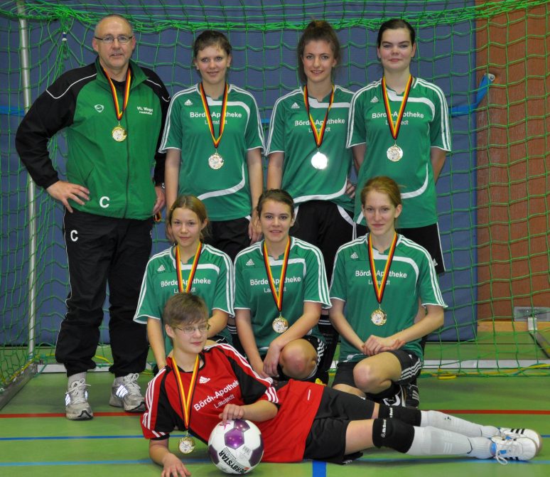 Das Siegerfoto zeigt Johanna Oellrich, Nane Sobottka, Rabea Schwarz, Trainer Johann Schult (hinten von links); Johanna Faber, Annika von Thaden, Julia Martens (vorne von links); liegend Torfrau Julia Rieper.