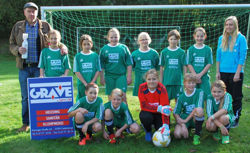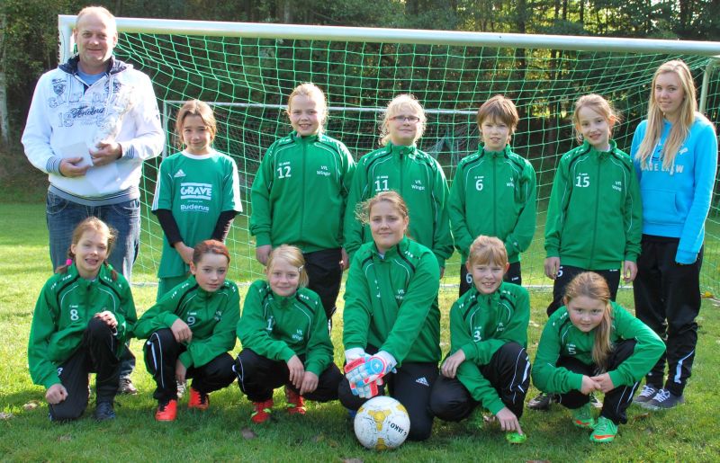 Die D-Juniorinnenmannschaft des VfL Wingst erhielt kürzlich einen Satz neuer Trikots von der Cadenberger Firma Grave „Heizung-Sanitär-Klempnerei“. Schon seit vielen Jahren unterstützt Walter Grave die Nachwuchsteams des VfL Wingst. Bei der Übergabe bedankte sich die Mannschaft dafür mit einem kleinen Präsent. Das Foto zeigt Sponsor Walter Grave, Tochter Nova Grave, Anna Schubert, Fenja Meyer, Zoe Ciplik, Sarah Binke, Miriam Kallinna (hinten von links), Angelina Gloystein, Marieke Eilers, Natalie Reyels, Kim Griemsmann, Jolina Suhr (vorne von links), es fehlt Trainerin Claudia Sahlke.