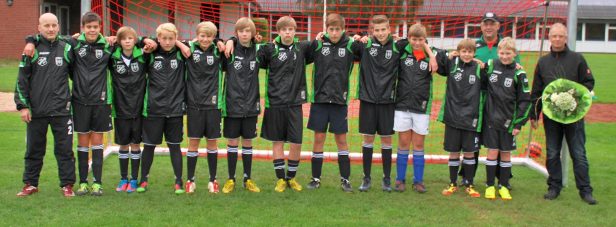 Einen neuen Satz Regenjacken erhielt kürzlich die C-Juniorenmannschaft U15 der JSG Wingst/Oberndorf vom Cadenberger Schornsteinfeger- und Energieberatungsbetrieb Torsten Matuschak. Torsten Matuschak kümmert sich um Brandverhütung, Umweltschutz und Energieeinsparung. Die Mannschaft und das Betreuerteam bedankten sich dafür bei dem großzügigen Sponsor mit einem großen Blumenstrauß. Das Foto zeigt Betreuer Thomas Schütt, Tim von Glahn, Joshua Tietje, Finn Niklas Schütt, Benedikt Fastert, Lukas Feldhusen, Luca Föge, Felix Hasselbusch, Luca Zerreck, Ole Stangier, Josha Carroll, Betreuer Matthias von Glahn, Jan-Philip Rohlwing, Sponsor Torsten Matuschak (von links); es fehlen Melvin Weichert, Josh Griemsmann, Alex Meier, Trainer Richard Grantz.