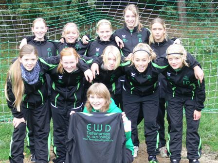 Kürzlich wurden die erfolgreichen Wingster Nachwuchsfußballerinnen mit neuen Trainingsanzügen ausgestattet. Sponsor war erneut die Firma EWD aus Bremerhaven, die kürzlich bereits einen Satz Sporttaschen gesponsert hatte. Die dort ansässige Firma besteht seit 2008 und kümmert sich mit rund 15 Mitarbeitern um Tiefenerdarbeiten und Grundstückspflege. Das Foto zeigt Silja Brand, Lisa Albers, Melanie Drewes, Rhodée van Rossum, Katja Walter (hinten von links); Stina-Maria Bebba, Denise Uhte, Miriam Kallinna, Noémi Itgen, Merle Albers, (Mitte von links) und Lara Schmidt (vorne).